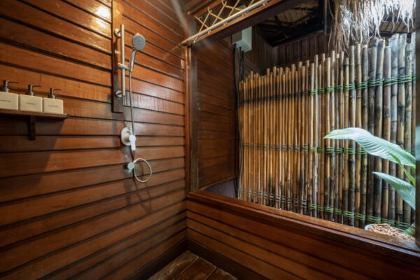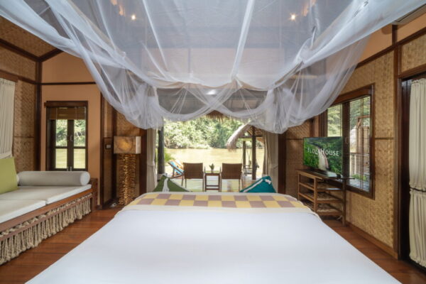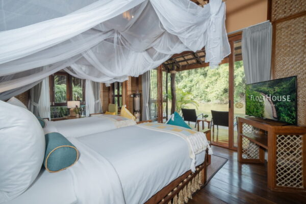 We stayed 2 nights in room 5B at this very special place. I loved the long tail boat ride ( about 25-30min) to get there – felt very romantic and adventurous. The food at the restaurant was excellent and the staff very helpful. Our room had great wifi. Loved the canopy bed ( slept very well) and open air shower. We spent as much time as possible on our vernandah soaking up the atmosphere and surroundings but also had time to explore. I loved lying on the over water vernandah at night star gazing. Another highlight was jumping in the River and floating down it – current very strong so you need to wear the provided life jackets. The Float House is also a 5-10 min walk to the Lawa caves which if you have the energy is definitely worth the visit.