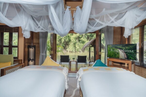 The Pride of Thailand - One of the best elegant Kanchanaburi hotels-The FloatHouse River Kwai floating resort aims to be the world’s best floating villas. The FloatHouse River Kwai Resort is a nature hideaway and can be found in very few places in the world. Each luxurious and spacious floating villa is totally private and rich in custom tailored-made teakwood furniture with thatched roofing creating a smooth blend between local artistic traditions and the natural environment.